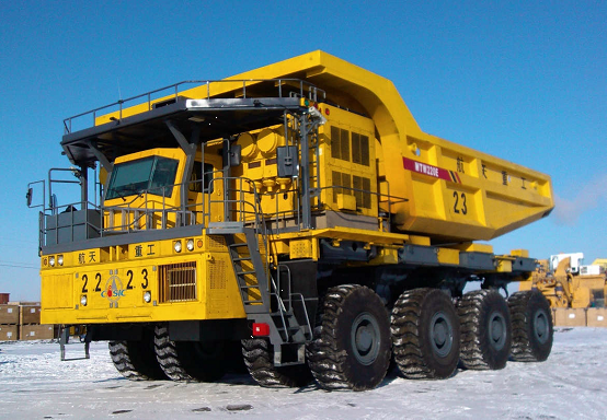 新型節(jié)能多軸重型礦用自卸車(chē),已經(jīng)載重220噸進(jìn)行了2000公里的路面各項(xiàng)試驗(yàn),在內(nèi)蒙古露天礦克服當(dāng)?shù)亓阆滤氖鹊膼毫犹鞖鈼l件,每天分三班正式運(yùn)行。該車(chē)采用4軸線、8個(gè)懸架、16×16輪驅(qū)動(dòng)、輪轉(zhuǎn)向等結(jié)構(gòu)形式,綜合運(yùn)用了雙發(fā)動(dòng)機(jī)聯(lián)合動(dòng)力、車(chē)輪立電驅(qū)動(dòng)技術(shù)、大行程液壓懸架、擺動(dòng)軸技術(shù)、箱型車(chē)架、液壓制動(dòng)和轉(zhuǎn)向、遠(yuǎn)程監(jiān)控自動(dòng)診斷等先進(jìn)技術(shù),提高了車(chē)輛道路適應(yīng)性,降低了道路維護(hù)頻次和成本,延長(zhǎng)了輪胎壽命,同時(shí)具有轉(zhuǎn)彎半徑小、機(jī)動(dòng)性能好、供貨周期短、采購(gòu)及維護(hù)成本低等優(yōu)點(diǎn),別適應(yīng)于大中型露天礦山開(kāi)采運(yùn)輸和大型工程施工。